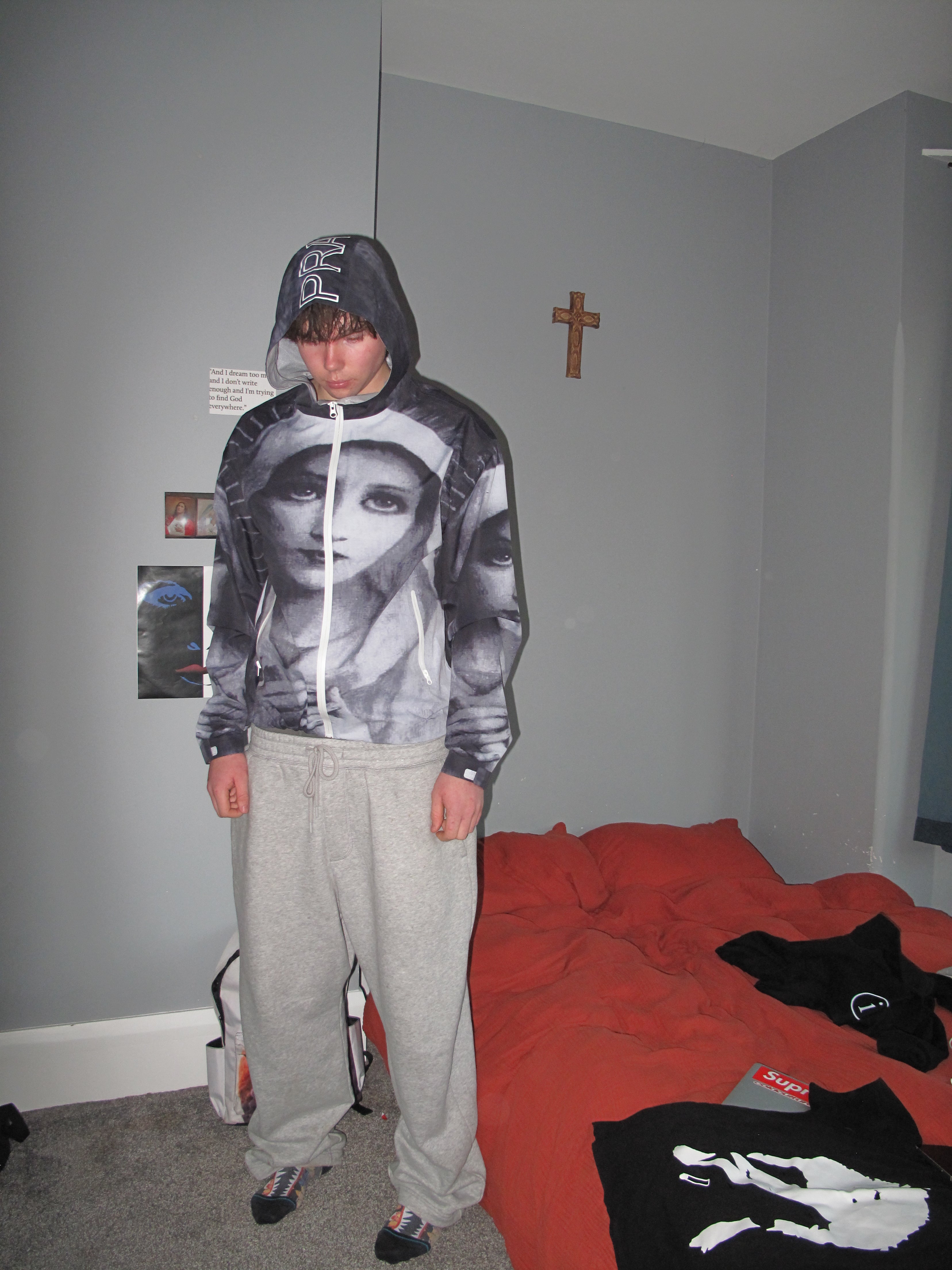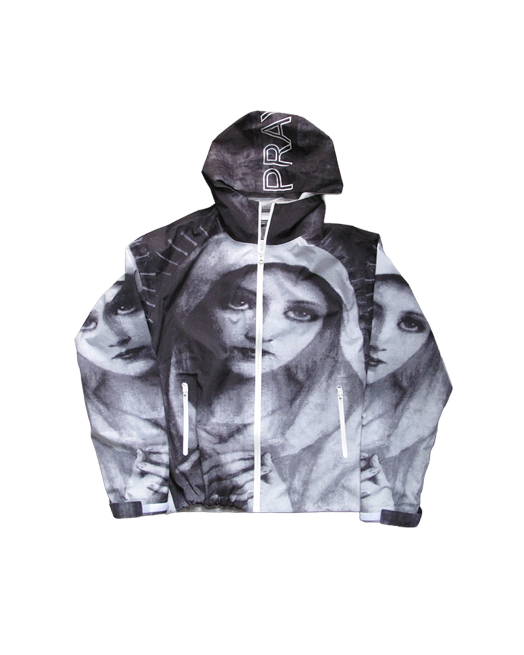 features custom white zippers, sinches at the waist line, and adjustable wrist cuffs